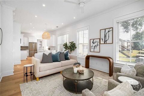 Experience vibrant Starland District living at its finest. Steps from Starland Yard, Flora & Fauna, and Savannahs trendiest restaurants and bars, this stunning, nearly new townhouse blends modern luxury with timeless charm. A collaboration between NYC design firm Bedford Studio and local Ward Architecture, the home features 10 ceilings, Andersen windows, and custom hardwood floors. The chefs kitchen offers sleek quartz countertops, premium stainless appliances including a ZLINE oven, gas range, and abundant storage. Three bedrooms and three full bathsincluding a main-level suiteshowcase designer tilework, Moen bathroom faucets, double vanities, and spa-style showers. Spray-foam insulation, tankless water heater, and Energy Star washer/dryer add efficiency. Outside enjoy a welcoming front porch, fenced backyard, and dedicated off-street parkingall in one of Savannahs most exciting neighborhoods.