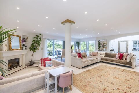 The garden level features a second living room with a bar and open-plan kitchen, a gym and an independent apartment, ideal for hosting guests.