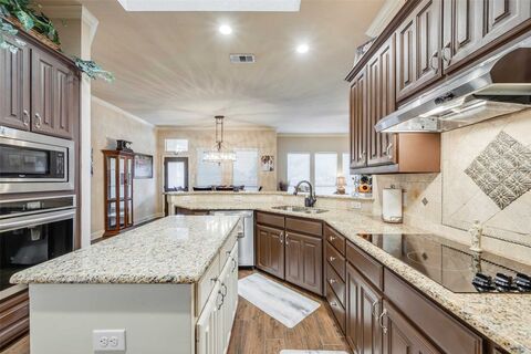 Pristine home with exceptional curb appeal, highlighted by beautiful landscaping and a welcoming front porch. Nestled in a quiet, established neighborhood with convenient access to I-35 and Hwy 820. This well-designed home offers 3 spacious bedrooms, 2 full baths, two primary bedrooms, formal living and dining areas accented with crown and chair rail molding. A generously sized family room featuring a cast stone fireplace with mantle is the heart of the homeperfect for relaxing or entertaining! This fantastic open floorplan suits any lifestyle. The large kitchen boasts an island, granite counters, abundant cabinet space, stainless steel appliances, built in oven, ample bar seating, and a cozy breakfast nook. The private primary suite includes a garden tub, separate shower with seamless shower glass, granite counters, large walk in closet, and a comfortable retreat-like feel. Enjoy outdoor living in the gorgeous backyard with mature trees and a tiled covered patio, ideal for morning co