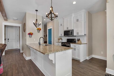 Enjoy the beautiful setting of this charming 3-bedroom, 2-bath home located in Lindale ISD on a spacious 0.582-acre lot. Relax on the covered front porch or unwind on the back patio overlooking the large, fully fenced backyardperfect for outdoor hobbies, pets, or entertaining. Inside, the open-concept living area features a cozy fireplace with gas logs and flows seamlessly into the kitchen, complete with a gas cooktop, large island with extra seating, and a generous pantry. Thoughtful details throughout include wood beams, custom wall treatment, an updated guest bathroom with dual vanities, and a built-in desk conveniently located near the kitchen. Owned solar panels will convey, helping offset energy use and operating costs. This inviting home offers comfort, functionality, and plenty of space to enjoy both indoors and out.