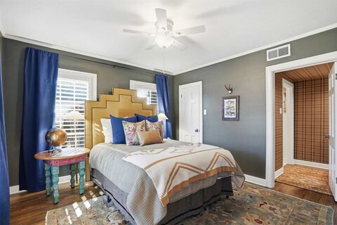 Curb appeal and timeless character meet fresh, elevated style in this beautifully updated Ridglea North home, set on an oversized lot and finished with thoughtful design at every turn. A welcoming landing and staircasehighlighted by a solid brass bannister and boxed wood trimset the tone the moment you step inside. The front living room is bright and inviting with exposed wood beams, and a fireplace that flows seamlessly into the fully renovated dining and kitchen areas. The kitchen features marble countertops, a charming banquette, updated appliances, and a spacious walk-in pantryblending function and style with ease. The primary suite offers a renovated bath and generous closets, while each additional bedroom includes its own en-suite bath. Wallpaper selections and design details throughout the home add personality and polish in all the right places. A separate 847-sq-ft guest house includes one bedroom, one bath, a full kitchen, and a large living roomperfect for guests or as an