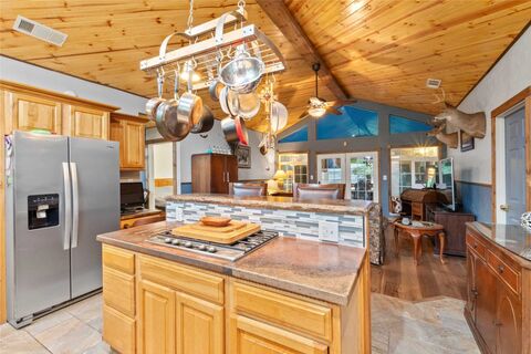 Wake up to deep water, wide-open views, and the rare bonus of two waterfront lots. This property is located on over 150 feet of deep water centrally located on Cedar Creek Reservoir. Room for the RV, room for the boats, and nearly half an acre on the lake. There are two boat houses that have been redone that include lifts that will accommodate 2 boats and 2 jet skis, a large back deck perfect for gatherings, a covered patio near the water ideal for crawfish boils and fish frys, a gazebo near the water with electricity and three outbuildings providing lots of storage for a variety of needs. Additional features include two driveways, fenced yard, patio wired for a hot tub, and new HVAC. The home is 3 bedrooms, 2 baths, with an open floor plan. Each room has been remodeled. The kitchen has beautiful concrete countertops, plenty of cabinets, kitchen island, gas cooktop, double oven and new dishwasher. The living area has wood floors, a beautiful pine ceiling and opens to a large enclosed