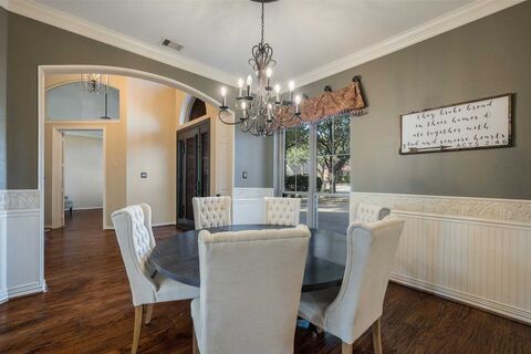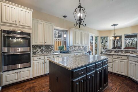 South Flower Mound, north facing creek lot with flexible living spaces inside and out. This 5 bed, 4 bath home offers two bedrooms with ensuite baths plus a private office on the main level, and three additional bedrooms with two full baths upstairs. The eat-in kitchen features a large island, double ovens, and a walk-in pantry. A wet bar sits between the dining room and family room, making entertaining effortless. Rich hardwood flooring runs throughout the home.The backyard offers private outdoor living with a play pool and a separate jacuzzi. The hot tub sits under an arbor with TV viewing, while a covered patio built off the breakfast room in 2024 provides a full outdoor kitchen with black stone, burner, space for a Green Egg, refrigerator, and built-in trash drawer. Extensive upgrades throughout. See full list in documents.Conveniently located just 5 minutes from Hwy 121 and 10 minutes from DFW Airport.