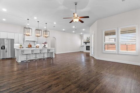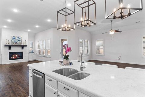Elegant, and impeccably appointed, this single story residence offers timeless finishes and is located in a prime location. From nail-down hardwood floors to plantation shutters throughout, every detail reflects quality and intentional design. The heart of the home is a chefs kitchen centered around an oversized quartz island, complete with a 5-burner gas cooktop, double ovens, abundant cabinetry, and a large walk-in pantry, perfect for both everyday living and elevated entertaining. An inviting hearth room provides flexible space for a second living area or an intimate dining setting, seamlessly connecting function and flow. The private primary suite is a true retreat, the primary bathroom is highlighted by dual sinks, a spacious walk-in shower, and generous vanity space. Two additional bedrooms offer comfort and versatility for guests, work, or hobbies. Step outside to an oversized covered patio ideal for morning coffee or evening gatherings, all framed by manicured landscaping edg