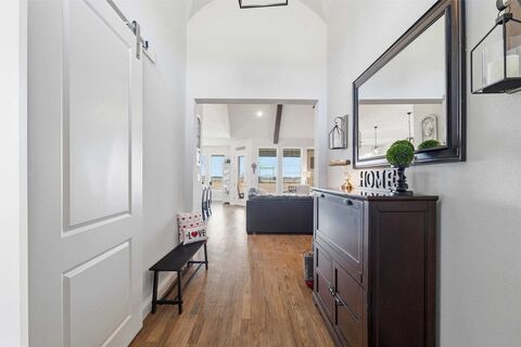 Gorgeous single story home sitting comfortably on just over an acre, this beautiful property has something for everyone. Upon entry, you are greeted with stunning hardwood floors and views for miles as there are no backyard neighbors, ever. The open concept floor plan is an entertainer's delight, the stunning high end kitchen has granite counters, farmhouse sink, and upgraded appliances. All while overlooking the LARGE living room with wood beamed, vaulted ceilings that create a grand feel while the expertly crafted brick and stone WBFP makes for cozy evenings inside. Unwind in the generous master suite at the end of the day or roast marshmallows on your back patio in your outdoor fire place with friends! Private office space in the front of the home offers a quiet place to work from home. This property has a split bedroom layout with 3 additional bedrooms and a beautiful bathroom. Just outside the mudroom by the huge 3 car garage is a separate utility room with sink and space for a