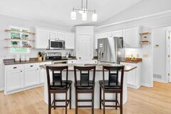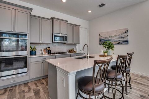 This extremely well-maintained, nearly new home truly showcases pride of ownership with no deferred maintenance. Designed for effortless living, it features a low-maintenance exterior and sophisticated custom interiors throughout. The open floor plan is enhanced by 8-foot doors, custom paint, and striking waterfall kitchen cabinetry, creating a modern yet welcoming feel. The chefs kitchen boasts quartz countertops, 42-inch upper cabinetry with crown molding, stainless steel appliances, and a double ovenperfect for everyday living and entertaining. The spacious laundry room offers ample storage and space for a freezer. Both guest and primary baths are beautifully appointed with quartz countertops and undermount sinks, while the primary bath includes a double shower with bench seating and a quartz vanity counter top. Energy efficiency and comfort are top priorities with triple-coated Low-E, floor-to-ceiling vinyl windows throughout, a 16 SEER-rated HVAC system, roof ridge ventilation,