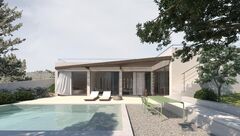 The house is designed on one level and features an open-plan kitchen, dining area, and living room. Large balcony doors allow plenty of natural light and provide direct access to a pergola-covered terrace and the private swimming pool, creating an ideal setting for relaxation and entertaining.