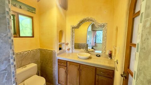 The home is open plan ranch style with high wood vaulted ceilings, spanish terracotta tile, and loads of built in cabinets and storage closets.