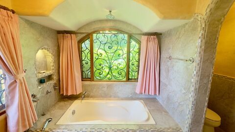 The bathrooms are elegantly outfitted with tile and soak in tubs.