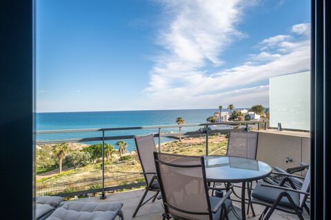 Upon entering the property, you are greeted by a generous, modern, and fully equipped kitchen, a stylish guest toilet, and an expansive open-plan living and dining area. Floor-to-ceiling windows bathe the space in natural light while offering uninterrupted views of the sparkling sea, creating a sophisticated and serene atmosphere perfect for both relaxation and entertaining.