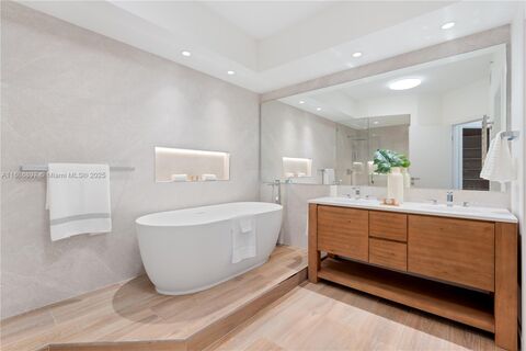 Luxury continues throughout the home with European solid wood doors with concealed hinges, offering a seamless, modern aesthetic. The expansive master suite is a private retreat with dual vanities, a soaking tub, and a glass-enclosed shower.