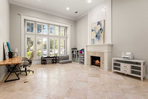 Set on nearly one acre along the prestigious Gleneagles Kings Course No. 3 Tee Box, this exceptional golf course estate offers refined luxury and resort-style living in a breathtaking setting. A grand entry with double iron and glass doors opens to elegant interiors defined by travertine flooring, soaring ceilings, and impeccable craftsmanship. The living room features a stately fireplace, built-in cabinetry with a wine refrigerator, and a wall of windows showcasing panoramic fairway views. The chic dining room sparkles beneath a designer chandelier and is complemented by a fully appointed butler's pantry. Designed for entertaining, the spacious den includes a walk-in wet bar with a wine closet, wine refrigerator, and ice maker, a fireplace, built-ins, and doors that open seamlessly to the patio. The expansive chef's kitchen centers around a large island and tall counters topped with striking Calcutta marble. Luxury appliances include Sub-Zero stainless steel refrigeration and a Wolf g