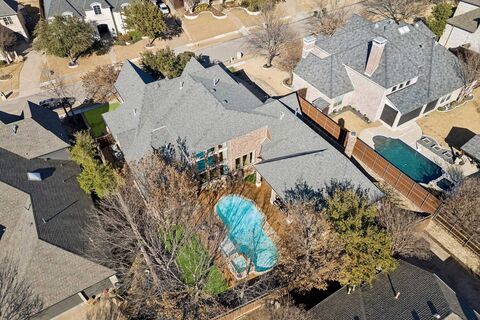 Spanning 5,731 square feet, this Lonnie Gray custom estate home blends impressive scale with warmth and everyday livability. With 4 bedrooms, 4.5 baths, and a 3-car garage, the home is thoughtfully designed for both grand entertaining and comfortable daily life. Located in the desirable Shoal Creek community, residents enjoy scenic jogging trails and tranquil neighborhood ponds. Just minutes from Grandscape and Legacy West, the property offers convenient access to premier shopping, dining, and entertainment while preserving a sense of privacy and retreat. A dramatic entry sets the tone with soaring ceilings, heavy crown moldings, rich hardwood floors, and a wall of windows that fills the space with natural light. The private study features custom built-ins, and the formal living room showcases a chandelier that electronically lowers and raises for effortless maintenance. Two staircases frame the homes well-planned layout, which includes formal living and dining rooms, a private den, a