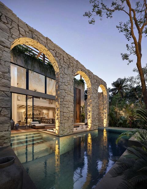 Every aspect of this property reflects an unwavering commitment to iconic design and harmony with nature, from the five monumental arches that illuminate in a radiant halo creating an ever-changing play of shadows and light, to the organic materials and curated textures that celebrate timeless elegance. One suite is secluded in the exterior, creating the ideal setting for romantic and private moments surrounded by nature, while two others open onto exterior terraces, merging interior rest with fresh air and jungle views. This villa is not merely a residence; it is a livable work of art for those who see architecture as a sanctuary and artistic expression.