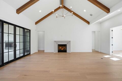 Rare opportunity in beautiful Montrachet. This brand-new, single-story residence offers 4 bedrooms and 4.5 baths with oak flooring and refined, high-end finishes throughout, perfectly suited to this exclusive guarded and gated community. A striking six-pane glass and metal front door welcomes you into a spacious entry and open great room featuring soaring beamed ceilings, a gas fireplace, and expansive views of the large, private backyard. The great room flows seamlessly into the gourmet kitchen, complete with a built-in refrigerator, six-burner gas cooktop, double ovens, and an oversized island accented by dramatic pendant lighting. A full butlers pantry with microwave is tucked behind the kitchen for added convenience. The adjacent dining room is wrapped in windows on two sides, offering abundant natural light and views of the backyard and covered patio with outdoor fireplace. French doors off the great room lead to a dedicated office. A second living room is located next to the din