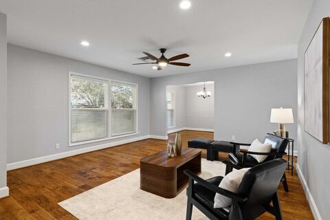 Nestled deep among the trees on a .3-acre cul-de-sac lot sits this meticulously maintained and updated transitional home in highly desirable Glen Meadow Estates. This 4-bedroom, 2-bath home offers 2,232 square feet of thoughtfully designed living space with an open layout great for easy living and entertaining and IS PRICED BELOW APPRAISED VALUE! The open-concept kitchen with extended peninsula allows for counter seating and also features quartz countertops, Shaker-style cabinets & soft-close drawers. Stainless appliances include convection Frigidaire Gallery double ovens, LG microwave, KitchenAid dishwasher, & 5-burner Whirlpool gas cooktop. Main living spaces, including the dining room, feature handscraped wood floors. Formal dining room is situated perfectly between the formal living space and kitchen. Main living space is open to kitchen with a captivating stone wall that includes a gas log fireplace as well as great views of the backyard. Large primary bedroom features a walk-in c