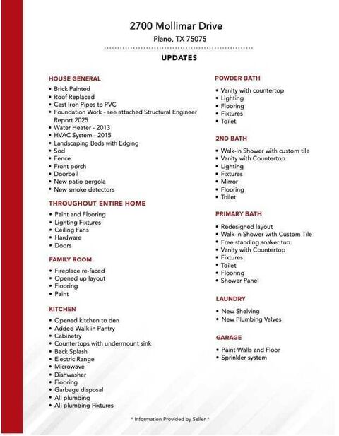 Located in the heart of Plano, this beautifully remodeled one-story home reflects thousands of dollars in thoughtful 2025 renovations, offering comfort, style, and effortless everyday living. Updated from top to bottom, this 3-bedroom, 2.1 Bath residence features a flexible floor plan and modern finishes that feel fresh, warm, and truly move-in ready. Luxury vinyl hardwood floors run throughout the home, creating a seamless and consistent flow from room to room while providing durability and easy maintenance. Natural light fills the open living spaces, setting an inviting tone for both entertaining and quiet evenings at home. The fully renovated kitchen showcases quartz countertops, stainless steel appliances, updated cabinetry, and a spacious walk-in pantry a standout feature that adds both function and storage. The kitchen opens effortlessly to the living area, making gatherings feel easy and connected. The primary suite serves as a peaceful retreat with a spa-inspired bathroom fea