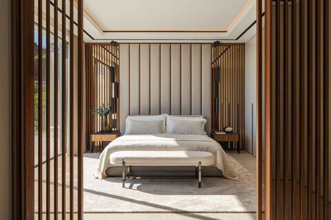 This frontline golf residence in La Quinta, Benahavis occupies an elevated 1,009 m2 plot with 771 m2 of meticulously executed interiors and 225 m2 of terraces, combining architectural precision with panoramic views of the golf course and the Mediterranean beyond . The design is defined by clean lines, symmetry and expansive glazing, creating a seamless dialogue between interior sophistication and the surrounding landscape. The layout is distributed over multiple levels, centred around a bright open-plan living and dining area where large sliding panels retract fully to connect the interior with the main terrace. Aalto Exclusive Design interiors introduce natural tones, bespoke wood detailing and integrated lighting, delivering a refined yet functional atmosphere. The sleek kitchen features premium appliances, generous preparation space and direct access to outdoor dining areas, making the main floor ideal for both daily living and entertaining. The principal suite enjoys private upper-level terrace access and uninterrupted views, complemented by a spa-style bathroom and custom wardrobes. Five additional bedrooms, all en suite, are designed with the same attention to material quality and comfort, ensuring privacy for family and guests. Guest toilets on the main level enhance practicality when hosting. Entertainment and lifestyle facilities are concentrated on the lower level, where a custom-designed lounge with full bar provides an elegant social setting. This level also incorporates a private gym and a dedicated leisure area that elevates the home beyond standard residential living. Wellness facilities reflect a five-star resort standard, featuring an indoor spa with heated pool and sauna, offering year-round relaxation in complete privacy. Outdoor living is a focal point, with an infinity-edge pool overlooking the fairways, a sunken chill-out area, fully equipped BBQ station and multiple zones for dining and lounging. Upper terraces extend from the bedrooms, creating intimate spaces to enjoy morning sun and evening sunsets. A secure gated entrance leads to a private garage with space for two vehicles and an electric vehicle charging point, reinforcing both convenience and exclusivity. With a south-east orientation, the property benefits from abundant natural light and open views across La Quinta Golf towards the Mediterranean coastline. Situated in one of Benahavis' most prestigious enclaves, La Quinta offers immediate access to La Quinta Golf & Country Club, luxury spa facilities, fine dining at the Westin La Quinta, and scenic walking trails. Puerto Banus, with its marina, designer boutiques and beach clubs, is approximately ten minutes away, while Marbella town centre, international schools and the beaches of the Costa del Sol are all within easy reach, making this an exceptional primary residence or high-end holiday retreat.