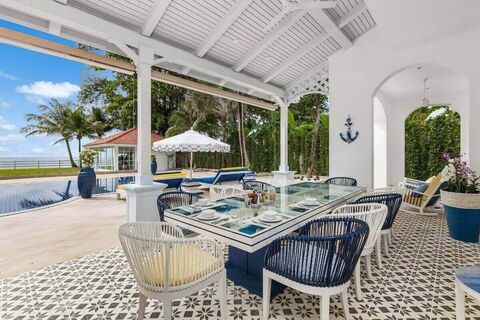 Automated gates open to a circular driveway with parking for up to 12 vehicles, framed by mature tropical gardens. Outdoor living includes a wrap-around veranda, covered dining and lounge terraces, and a 17.5 x 7.5 metre swimming pool set against expansive beachfront lawns. A beachfront sala houses a gym, steam room, and massage area, alongside an alfresco dining space with BBQ kitchen just steps from the sand.