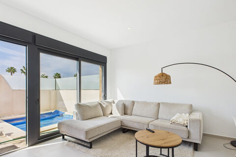 KEY READY, yet almost NEW, 3, bedroom, 2.5 bathroom Villa, situated in Torre Pacheco.Being sold unfurnished, this immaculately presented Villa, benefits from hot & cold air-conditioning, master bedroom on-suite, open-plan kitchen, spacious solarium (with WC) and summer kitchen area and private pool.Walking distance to ALL amenities and just fifteen minutes by car to the beautiful beaches of the Mar Menor.Excellent opportunity, must be seen to be appreciated. Furniture Optional (€20,000)Purchased as a new build in May 2024, the home has been thoughtfully improved with high-quality features for maximum comfort and ease of living. ideally located just eight kilometres from the Mar Menor lagoon, in a very quiet area that's still very near to everything.Optional - Solar panels : 6000 Euro - Two Toldo's : 4000 Euro DisclaimerWe endeavour to maintain accurate depictions of properties in Virtual Tours, floor Plans and descriptions, however, these are intended only as a guide and purchasers must satisfy themselves by personal inspection.