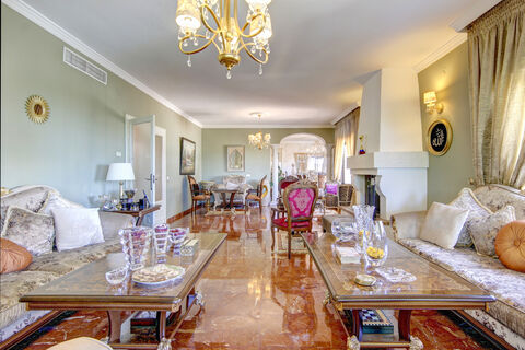 Discover an extraordinary opportunity with this magnificent 6 bedroom villa, a true gem situated within the prestigious Paraiso Alto part of Benahavis, an exclusive residential haven nestled between the charming towns of San Pedro and Estepona. Elevated to perfection, this property offers an awe-inspiring vantage point, revealing sweeping vistas that encompass the azure Mediterranean, verdant golf courses, and majestic mountains in the nearby areas.This villa showcases a timeless Mediterranean elegance, positioned to harness the full splendor of its surroundings. The entire property is securely enveloped by a perimeter fence. As you approach the home, an automated gate smoothly ushers you along, passing the villa's inviting front door and leading directly to a convenient covered carport designed for two vehicles. Upon entering, a landing gracefully connects to all the quarters on this floor.The home is entered on its upper level, a sanctuary of lavish living and sophistication. A capacious and opulent living room, an elegant dining area, and a fully equipped kitchen harmoniously presented in the same levels of comfort and luxury. This level is equipped with three bedroom suites, including dedicated service quarters, each meticulously crafted with the utmost attention to detail. Blending the indoor-outdoor lifestyle, glass curtains are installed in the spacious main terrace on this level which is perfect for admiring the panoramic views of the sea and golfing greens that provide a backdrop to the glistening pool and garden below.Descending to the lower level, an additional trio of bedrooms beckons, highlighted by a master suite that opens gracefully onto an inviting terrace. This level also reveals a modern living room complete with a kitchenette, creating an ideal space for intimate family gatherings. Thoughtful conveniences include a dedicated laundry room, a rejuvenating Turkish bath, and an expansive storage area, currently fashioned into a walk-in wardrobe.Stepping outside, the enchantment continues in the meticulously landscaped garden. Far ranging golf and mountain views can be enjoyed from the garden which centers around its good sized pool surrounded by manicured lawns. An outdoor BBQ and chill-out area offer a haven for both culinary and relaxation pursuits, ensuring year-round enjoyment of the alfresco lifestyle. The garden, a harmonious blend of open and covered spaces, caters to sun worshippers and green-thumbed enthusiasts alike.Paraiso Alto is renowned for its collection of luxury homes and boasts proximity to the area's premier golf courses, making it a haven for aficionados of both luxury living and the fairway. Beyond the oasis of this exceptional home lies a world of convenience and accessibility, making this villa an exceptional choice for either a permanent residence or a cherished holiday escape. Estepona, San Pedro, and Benahavis are a mere 10-minute drive away, while Malaga airport can be reached within a comfortable 45-minute journey.