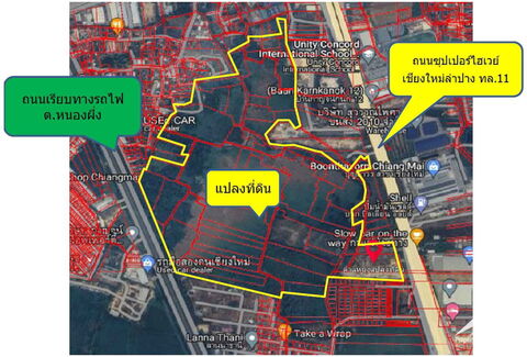 Conveniently located in between Hwy 121 & 3029, with two entrances on the Super Highway 11 (Chiang Mai-Lampang), and a rear entrance on the Railway Road, this large 238+ Rai (238-1-61.1) block of land in Saraphi is an excellent location for various types of development projects and only 1o km/10min from the Airport. Nearby Schools: - Americana Chinese International School (ACIS) - 1 km. - ABS - Ambassador Bilingual School - 1 km. - Unity Concord International School - 3.8 km. For sale at approximately 17,617 THB Sq.wah ( 7.047 M./ Rai) There is also a 3 to 9 Rai section of the front part of this land on the Superhighway that can also be purchased separately at 35,000 THB/ Sq.wah Contact us for details!