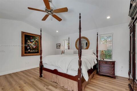 Spacious 5 bd/ 4 bath home on a wonderful tree-lined street in Palmetto Bay. Fabulous formal living & dining rms w/ volume ceilings. Impact windows. True chef s kitchen w/ gas stove, double wall ovens, wine coolers, ice maker & oversized eat-in island, opens to family rm w/ fireplace. Marble & wood floors. Nicely sized guest bdrms, 1 bdrm & full bath separate, perfect for an office. Grand primary suite w/ walk-in closets, bath w/ dual sinks, vanity, jetted tub, water closet. Fenced yard w/ deep covered terrace, remodeled, heated saltwater pool & spa plus covered summer kitchen area. Beautifully manicured landscaping. New central vacuum, security system. Newer AC units, ductwork & insulation. Circular driveway & 2 car side entry garage. A quick golf cart ride to Starbucks, Deering Estate.