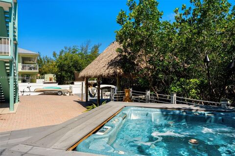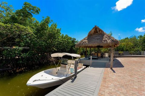 Welcome to the perfect Key Largo getaway! This Fully Furnished 4 Bedroom, 3.5 Bathroom, corner waterfront home offers ultimate privacy with 150 ft. of water frontage. Featuring a gated entrance and direct access to Florida Bay within a couple of minutes, this three-story home offers dockage for boats up to 34 feet and a fantastic waterfront Tiki Lounge & Outdoor Kitchen area. Bright & open living areas, a perfect family-friendly kitchen, 563 Sq. Ft. ground level billiard lounge & wet bar (bringing indoor area to about 2,339 Sq.Ft.), jacuzzi deck, and a 4th story rooftop sun-deck with spectacular water views and an outdoor shower. As a plus, this property may be used as a vacation rental with proper approval. Zoning allows for 28 day rentals.