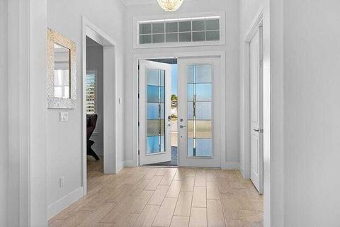 Coastal luxury meets lakefront serenity in Bent Pine, where an expansive lanai and a south-facing heated saltwater pool with waterfall spa create a true resort-style escape against a tranquil lake backdrop with Florida wildlife views. Travertine decking and a screened enclosure provide breezy, year-round outdoor living. Inside: 4 bedrooms, 3 baths, plus a den/flex room and private office. Chef's kitchen with stainless KitchenAid appliances and a walk-in pantry; 4.5'' plantation shutters and smart-home features throughout. Major upgrades include impact windows/doors, tile roof, and a 3-car side-load epoxy garage. Owned solar (30 panels) + 30 kWh Enphase battery, 4-stage filtration and RO, 60-amp EV circuit, and 10-camera security with Ring monitoring.