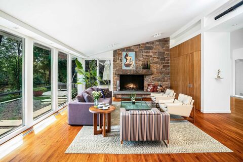 Experience the art of living well in this extraordinary private retreat overlooking Heaptaugua Lake. Set on just under five acres, the property offers total serenity while remaining just minutes from Chappaquas quaint downtown, restaurants, Metro-North, and shopping. Enter through the gates and follow the sweeping driveway as it curves past the pool house and pool, passing a sweeping lawn before reaching the main residence. This sophisticated one-level contemporary is deceptively understated from the front yet opens dramatically in the rear with walls of glass and lofted ceilings framing breathtaking views of mature trees and shimmering water. Multiple living spaces flow effortlessly to expansive terraces, anchored by a striking double-sided stone fireplace serving both the living and dining rooms. The private bedroom wing includes three bedrooms, highlighted by a serene primary suite with a stunning spa-like bath, while a separate fourth bedroom and family room on the opposite side o