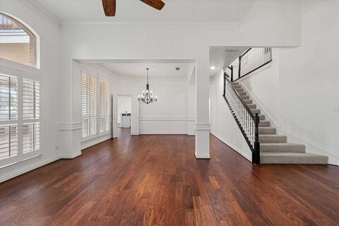 Situated along the golf course in prestigious Walnut Estates, this beautifully updated four bedroom three and one half bath home offers three distinct living areas and thoughtfully designed spaces for both everyday comfort and entertaining. Timeless plantation shutters and new can lighting enhance the main level, while the open kitchen anchors the home with a generous center island, granite countertops, newly updated cabinet hardware, abundant storage, and a built in wine refrigerator. A well organized laundry room with pantry and folding space is conveniently located near the main living areas along with a half bath. The primary retreat provides a private sanctuary with patio access overlooking the golf course, perfect for morning coffee, and a well appointed bath featuring custom cabinetry and cedar lined storage. Upstairs, all carpeting has been replaced with luxury vinyl plank flooring, the staircase bannister has been refreshed, and all walls throughout the home except the primary