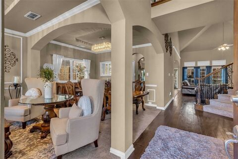 Step into this stunning 5-bedroom, 3.5-bath home that perfectly combines elegance and functionality. A grand curved staircase welcomes you into an open floor plan designed for comfortable living and effortless entertaining.The spacious kitchen features beautiful granite countertops, ample cabinetry, and a beautiful stone fireplace. Multiple living spaces include a dedicated media room for movie nights and a large game room ideal for entertaining, hobbies, or play.The private primary suite offers a relaxing retreat, while the additional bedrooms provide flexibility for guests, work, or family needs. Outside, enjoy the covered back patio perfect for outdoor dining and year-round gatherings.A rare 3-car garage and numerous upgrades throughout complete this exceptional home, offering both luxury and practicality in every detail.