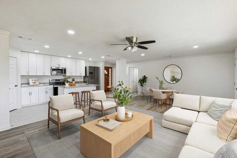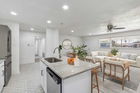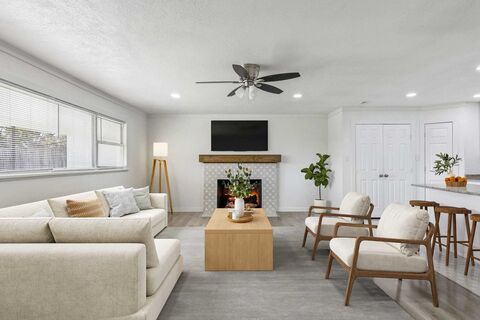 Welcome to this beautifully updated 3-bedroom home on Cape Cod, offering modern upgrades and effortless living. Recent improvements include a new roof, repaired foundation, fresh paint, new flooring, updated lighting and plumbing fixtures, new cabinets, and new countertops, making this home truly move in ready. Step inside to an open concept living, kitchen, and dining space filled with natural light. The updated kitchen features ample cabinetry, modern finishes, and a walk-in pantry for excellent storage. The living room centers around a cozy fireplace, perfect for relaxing evenings. The spacious primary suite includes a private en suite bath with a large walk-in shower. Two secondary bedrooms offer great size and share a generous hallway bath. Enjoy the large grassy backyard and covered patio complete with a built-in fireplace and grill, ideal for entertaining year-round. A 2-car carport and three exterior storage closets add extra convenience.