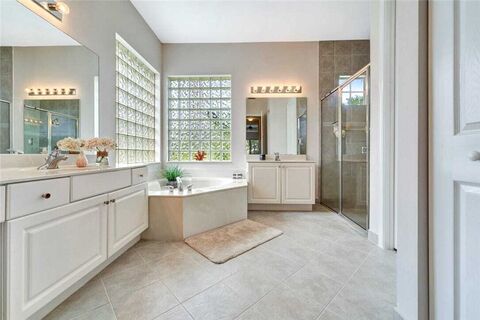 Exquisite lakefront 3BR + Den/4th BR, 2.5BA home on a premium cul-de-sac lot with a long driveway. This open floor plan is filled with upgrades: tile on the diagonal, plantation shutters, brand new kitchen appliances, a 2018 HVAC, and a 2022 water heater, and upgraded lighting. The spacious kitchen features upgraded white cabinetry and granite countertops. The owners suite offers dual vanities and a Roman tub. Relax on the screened-in porch with spectacular lake views and enjoy a large private backyard with beautiful landscaping. Resort-style amenities and low HOA fees. Szeapprox.subjtoerror