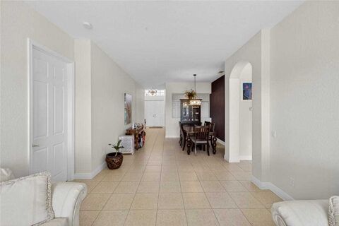 Lakefront 4BR/2BA home in a desirable gated community, featuring a freshly painted interior with soaring ceilings, tile in the main living areas, and laminate flooring in the bedrooms. The kitchen offers granite countertops, white cabinetry, and newer stainless steel appliances. HVAC 2018, HWH 2022, plus updated light fixtures and smoke detectors. Relax on the covered porch and enjoy peaceful lake views. Low HOAs with community pools, pickleball/tennis, basketball, fitness room, and clubhouse. Sizes approx. & subject to error.