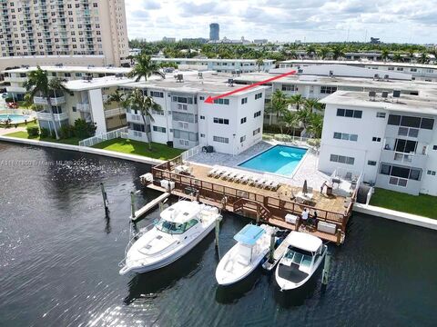 Beautiful water views of Golden Isles Lake from this 2-bedroom 2-bathroom waterfront condo in Hallandale Beach. The spacious unit features tiles throughout, impact windows and doors, kitchen with stainless steel appliances and granite countertop, plantation shutters. From your large enclosed balcony, take-in relaxing views of the lake and boats passing by. Enjoy lounging on the dock with a BBQ area near the pool.1 parking space. Pets welcome. Dock space for rent(waiting list). Ok to lease and no special assessment. Well-maintained boutique building with laundry facilities, conveniently located minutes from restaurants, shopping, grocery stores, and gorgeous Hallandale Beach. Short drive to downtown Hollywood, Aventura mall, Gulfstream Park, hospitals, Fort Lauderdale airport, and more.