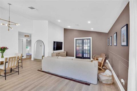 Beautifully renovated 3BR/2BA home in a non-HOA neighborhood! Major updates include 2013 metal roof, 2024 AC, 2023 water heater & recently pumped septic. Stunning kitchen with white shaker cabinets, quartz countertops, tile backsplash, island with bar seating & 2023 stainless appliances. LVP throughout, new trim/baseboards, recessed lighting & upgraded light fixtures. Flexible 2nd living area with French doors. Primary suite with tiled, frameless glass shower, garden tub, & walk-in closet. Fenced backyard, covered porch, dual driveways, irrigation on well, & 2-car garage! rmszaprx&sub2err