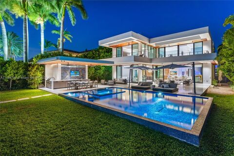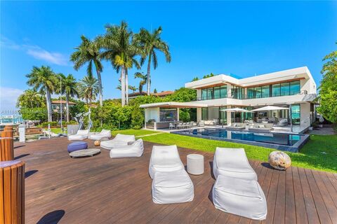 The ultimate waterfront residence for luxury living! Situated on prestigious North Bay Road in Miami Beach, this home boasts extraordinary west-facing city views with daily sunsets. 7 bedrooms, 7 bathrooms, 2 half-bathrooms residence with extravagant wet bar, indoor salt water fish pond with stingrays, home theater, chef's kitchen, gym, open floor plan with ample natural light with easy access to outdoors. This private + gated home with unmatched indoor/outdoor living spaces features a sensational roof top terrace, balconies, heated saltwater swimming pool + spa, covered summer kitchen with BBQ, full outdoor cabana bathroom, boat dock, 70' of waterfront, + 4-car garage with lift, elevator & generator