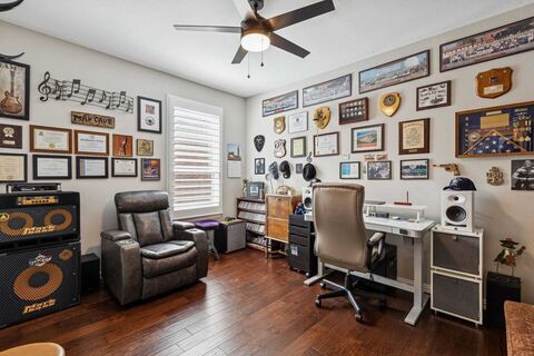 This home offers a beautifully updated blend of comfort, style, & functionality. The striking brick & stone elevation creates inviting curb appeal, complemented by a well-maintained front yard & welcoming covered entry. Inside, youre greeted an open-concept layout w-rich wood flooring that flows seamlessly through the main living areas. The spacious living rm features a tray ceiling & an abundant natural light, creating a warm yet refined atmosphere. The dining area connects effortlessly to the living spaceperfect for both everyday living & entertaining. The kitchen is a true standout, showcasing crisp white cabinetry, sleek hardware, quartz countertops,& a stylish backsplash. A large island w-seating provides ample prep space & serves as a natural gathering spot. SS appliances, modern fixtures, & generous storage complete this highly functional & visually appealing space. The adjacent breakfast nook offers additional flexibility for casual dining. The dedicated home office offers a
