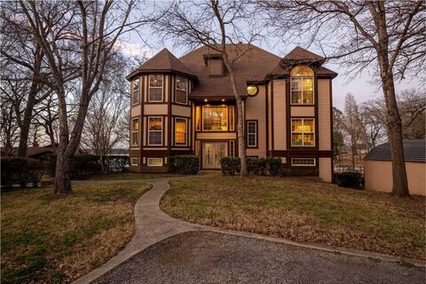 Castle like 3 story waterfront retreat located at the mouth of the channel, offering weather protection at the boat dock and amazing open water views from all over the house! Outside there is extra driveway space for huge family functions, two covered back porches, and a jacuzzi for unwinding after a day on the lake. Inside you will find soaring ceilings with tall dramatic windows, a striking double-sided fireplace anchoring the main living spaces and creating a warm inviting ambiance for lake retreat style entertaining. There is a dedicated office space and flex room. The primary suite is nothing short of stunning with a walk out water view balcony. Large spa like on suite with a huge jacuzzi tub and separate shower. The basement level of the home offers full guest living quarters with its own bedroom, full bath, full kitchen, and living area. You will find a full workstation with shelving and sink in the oversized garage. Lots of storage space with a huge walk-in pantry off the kitch