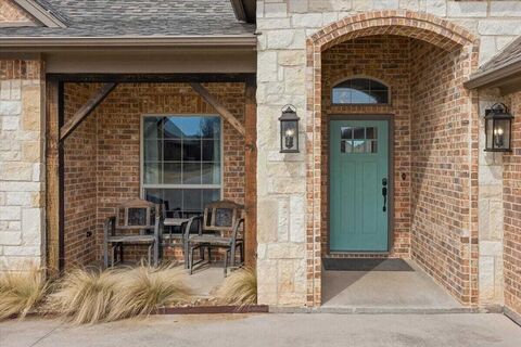 Centrally located in Aledo, this move-in ready single story brick and stone home features inviting curb appeal, a functional open layout, and new interior paint! Inside, wood flooring runs through the main living spaces and the layout flows easily for everyday living and entertaining. A formal dining room sits off the entry and connects naturally to the kitchen and living area. The living room features a brick fireplace, tray ceiling, and large windows that bring in natural light. The kitchen is open to the living space and offers granite countertops, extensive solid wood cabinetry, stainless steel appliances, gas cooktop, large island, pendant lighting, and bar seating. A breakfast area provides additional casual dining space. The private primary suite features vaulted ceilings and a spacious bath with dual vanities, soaking tub, separate shower, and walk in closet. Secondary bedrooms are well sized with flexible options for office or guest space. Laundry room includes built in cabine