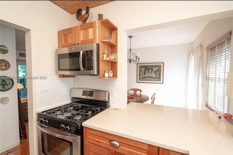 Boho-style charm in this Miami Shores garden first-floor apartment home with amazing natural light. Located in Shores Plaza East, a lush boutique community just east of Biscayne Blvd, this 2-Bed/2-Bath home features a fully renovated open kitchen with gas range & warm wood tones, terracotta floors in living area, terrazzo in primary BD, a designated screened-in terrace/lanai (over 230 SqFt), split floor plan, impact windows & doors, central AC, bath tubs in both bathrooms, and low HOA. This condo feels more like a home than a condo, with beautifully landscaped grounds & charming 2-story buildings. You will feel right at home with the warm and inviting energy of this unique property.