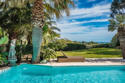it boasts lovely sea views and is set in a verdant garden with magnificent palm trees, offering a peaceful, relaxing atmosphere.