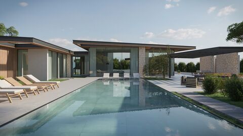 Project started in 2024 and to be finished by 2026. This bungalow style villa on a flat plot will offer 4/5 bedrooms and 4/5 bathrooms ensuite, an open plan lounge/dining room and kitchen. it will include a swimming pool, underfloor heating, garage for 3 cars, gym/spa and solar panels.