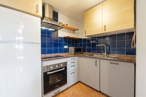 The apartment has an open and bright floor plan that naturally connects the kitchen and living room, creating a spacious and inviting atmosphere. The glass doors leading out to the private balcony allow plenty of natural light in and create a harmonious flow between inside and outside. On the balcony you can enjoy your morning coffee and the peaceful view of the green surroundings.