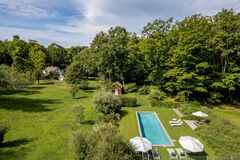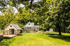 Welcome to Kanso Cottage Estate, a historic Hudson Valley retreat with roots stretching back to the late 1800s. Once part of a boys camp and originally built by Dutch settlers, this park-like 16-acre estate in Churchtown includes three dwellingsthe stone main house, a stone guest cottage, and a green guest cabinalong with additional structures including a pool house with outdoor shower and a potting shed. Rolling hills with fruit trees, terraced gardens, and a seasonal stream, lead to a heated gunite pool and a half basketball court. Set on a quiet road that loops through picturesque farmland, the enchanting property has been reimagined for modern living while retaining its timeless character. At the heart of the property is the stone main house, where wide-plank floors, a wood-burning fireplace, and sunlit dining room create a warm and inviting atmosphere. The dining room opens onto a private pea stone courtyard, perfect for entertaining or morning coffee. The kitchen is outfitte