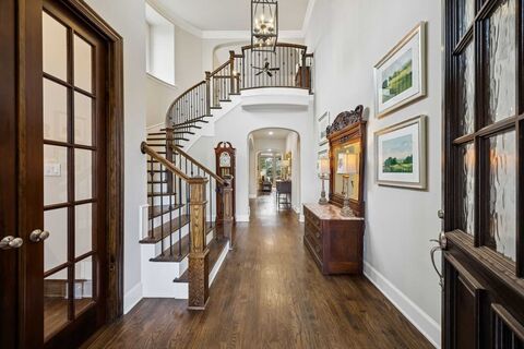 This stunning custom East-facing home offers a timeless blend of stone & brick architecture, exceptional craftsmanship, & resort-style outdoor living. A welcoming front elevation w-manicured landscaping & elegant lighting sets the tone for the quality found throughout. Step inside to an elegant interior defined by timeless design, rich finishes, & exceptional attention to detail. A grand entry welcomes you w-wood flrs, soaring ceilings, & a sweeping curved staircase accented by wrought-iron balusters, setting a sophisticated first impression. The study features custom built-ins & coffered ceiling. The expansive living rm is anchored by a striking stone fireplace with a wood mantel & framed by walls of windows that flood the space w-natural light & offer serene views of the backyard. At the heart of the home, the chefs kitchen impresses with abundant white cabinetry, an oversized, professional-grade appliances, double ovens, & designer pendant lighting. The primary suite is a true retr