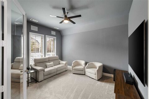 Dont miss this stunning Perry Home in the highly sought-after Mustang Lakes community of Celina, zoned to award-winning Prosper ISD! Ideally situated on a cul-de-sac street just steps from neighborhood parks, scenic trails, and green space. A grand entry and extended foyer with soaring 12-foot ceilings create a striking first impression, with abundant natural light throughout. French doors open to a spacious flex room just off the entry that has been equipped with surround sound for the perfect movie watching space. The open-concept design flows seamlessly into the expansive family room, where a wall of windows and a cozy fireplace anchor the space and create a warm, inviting atmosphere. The chef-inspired kitchen is truly the heart of the home. Featuring a large island, beautiful quartz countertops, stainless steel appliances, a gas cooktop, and plenty of cabinets, including a built-in hutch. Whether hosting gatherings or enjoying quiet evenings in, this layout is designed to bring pe