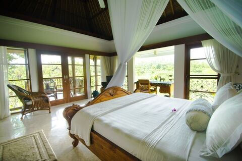 The interiors reflect a commitment to elegance and comfort. High vaulted ceilings, polished timber, and local stone accents create an atmosphere that is both sophisticated and grounded. Each of the five bedrooms is a private suite, designed to maximize views of the surrounding rice fields and gardens, ensuring that every guest or family member experiences the profound peace for which Bali is famous.