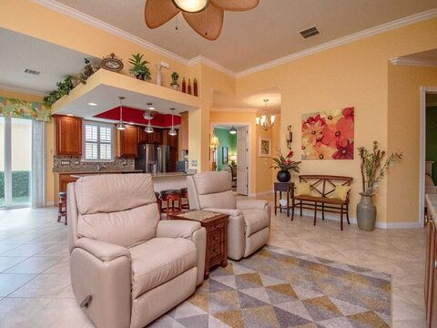Beautifully maintained Divosta-built Oakmont model in gated Isles at Waterway Village. This 3BR + den, 2.5BA home offers a light-filled great room floor plan. Kitchen has stainless steel appliances and opens seamlessly to the dining and living areas. Gorgeous Bellawood hardwood flooring enhances the bedrooms and den, with tile flooring throughout living spaces. Owners suite has dual walk-in closets, one doubling as a safe room. Also, impact windows, gutters, and a beautifully paved walkway. Amenities include clubhouse, pool, tennis/pickleball, fitness center, and more. Sizes appx/sub2err.